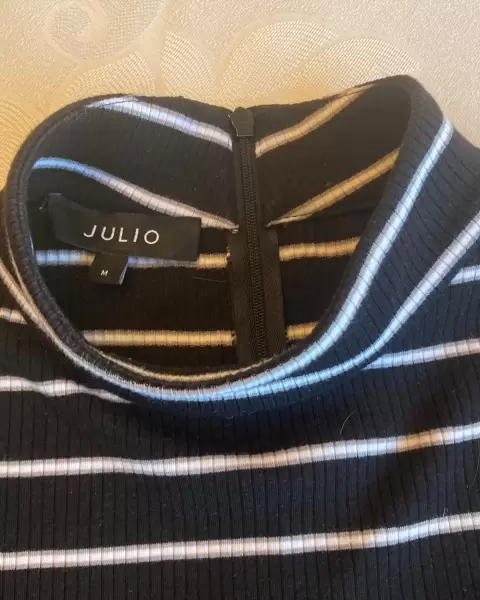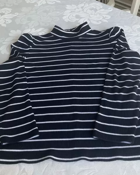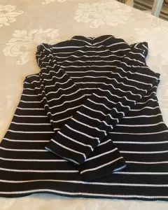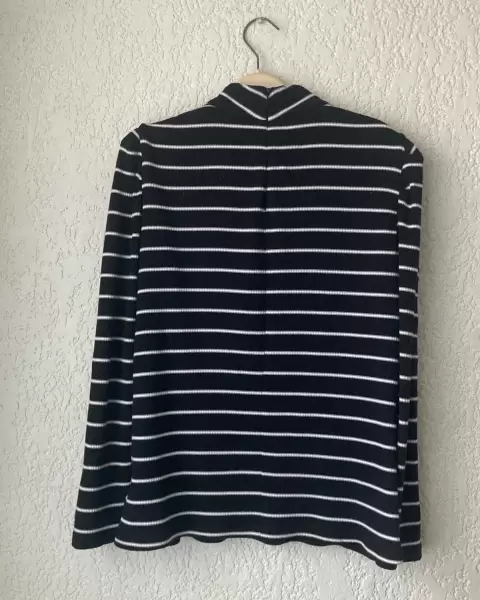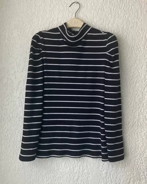 Blusa cuello alto, Julio T/M. Un básico, hermosa blusa, manga larga, cuello alto, 58% algodón, negra y rayas blancas, de axila a axila 49 cm, largo 60, sin detalles