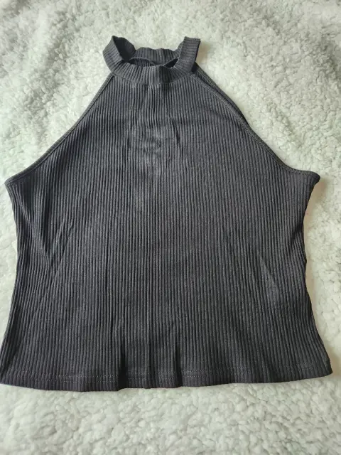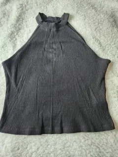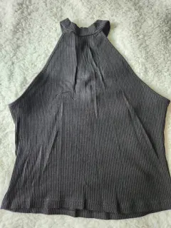 Blusa cuello alto, tipo halter, sin mangas, color negro de tela tipo tegida pero fresca, nueva sin usar pero no trae etiqueta, me quedo justa por eso la estoy sacando.