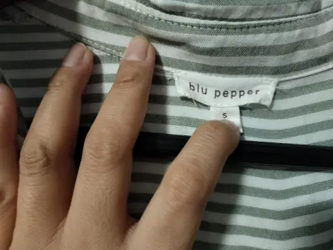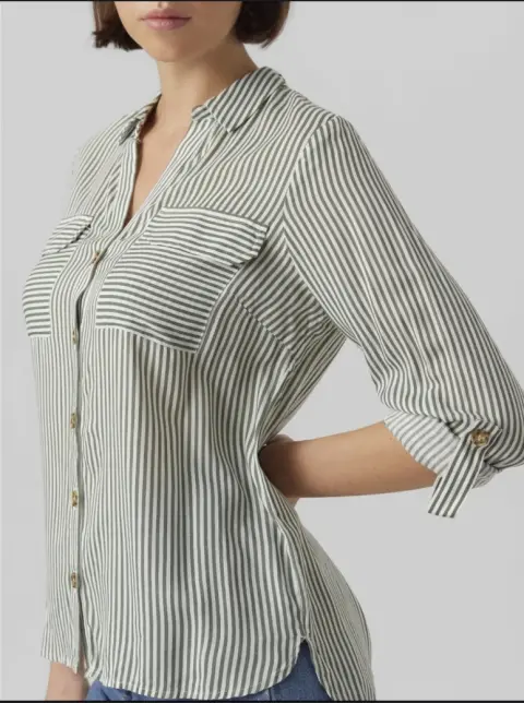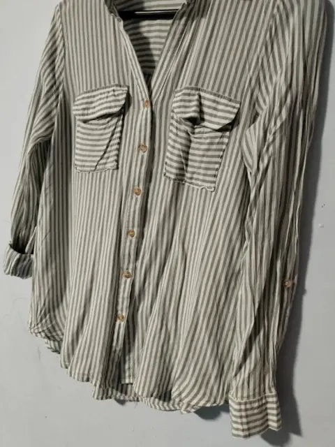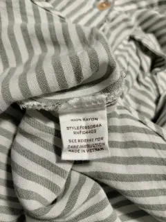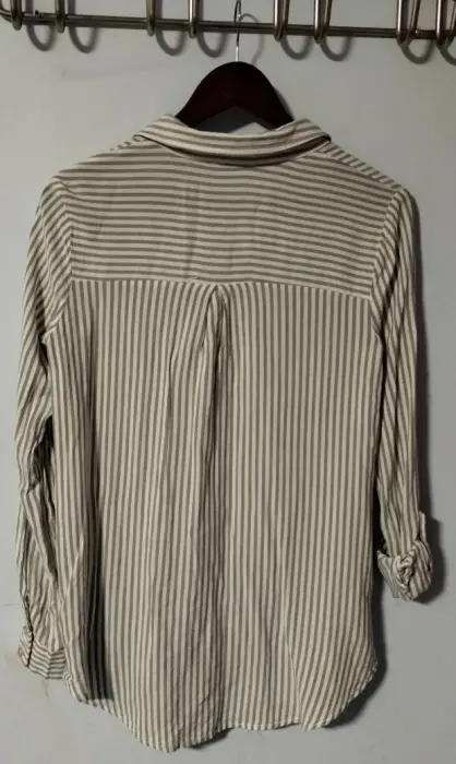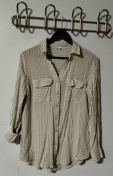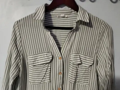 Blusa cuello camisero rayada. Blusa de cuello camisero a rayas de tela Nylon - NO estira con detalle de elevador en mangas y bolsas enfrente estilo asimétrica tal cual luce en la foto 1 ilustrativa puesta es talla S da a Mediana 46 de axila 39 de hombro luce hermosa y super fresca para esta temporada 👚😍🛍️💄💋