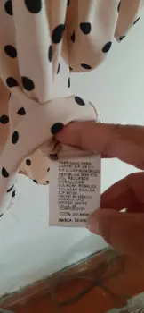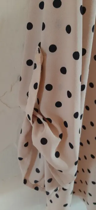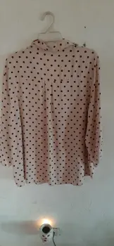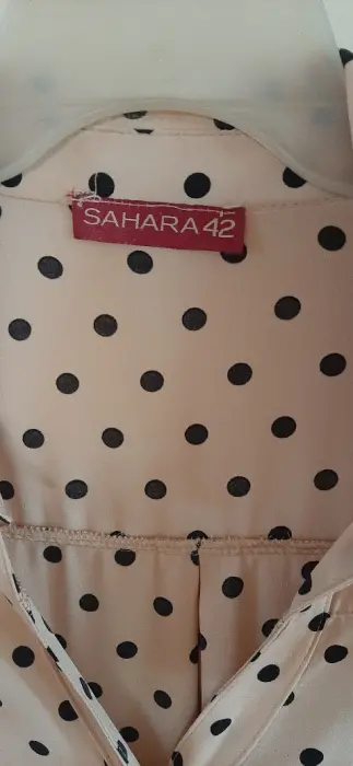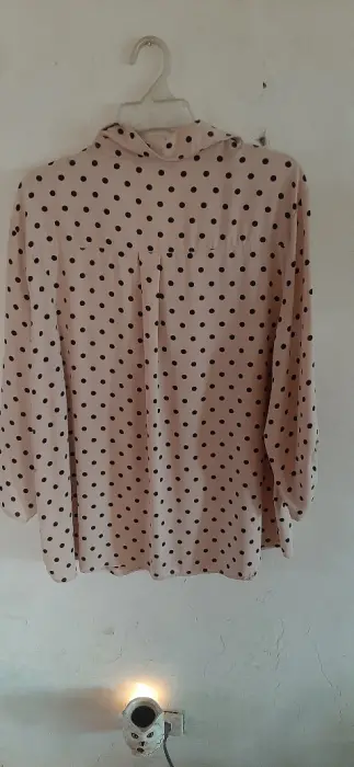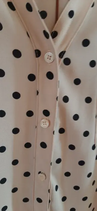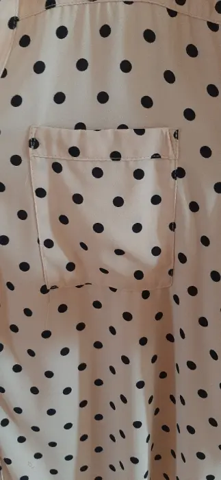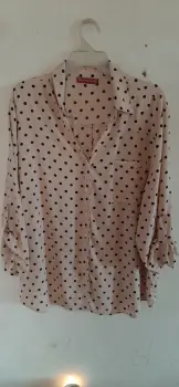 Blusa color base beige con bolitas negras. Talla 42 manga larga, de botones y bolso. Holgada.