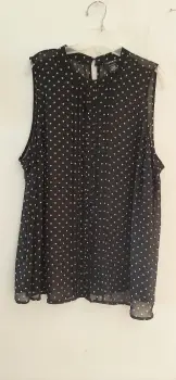 Blusa dama negra con puntos rosa viejo, desmangada. Semitransparente y holgada, perfecta para combinar con blazers. Talla 40, poliester. Detalles de surcido.