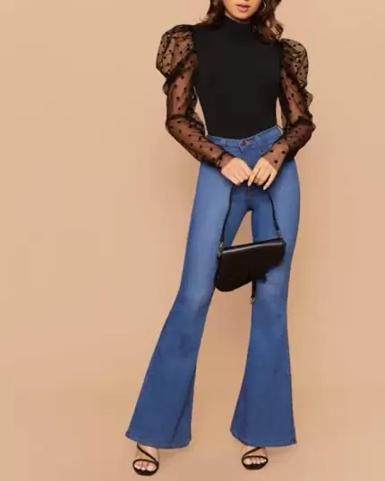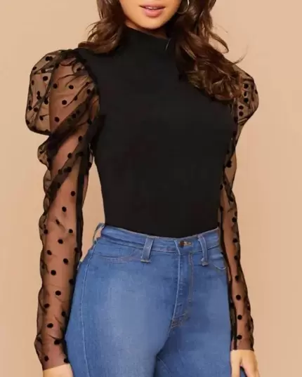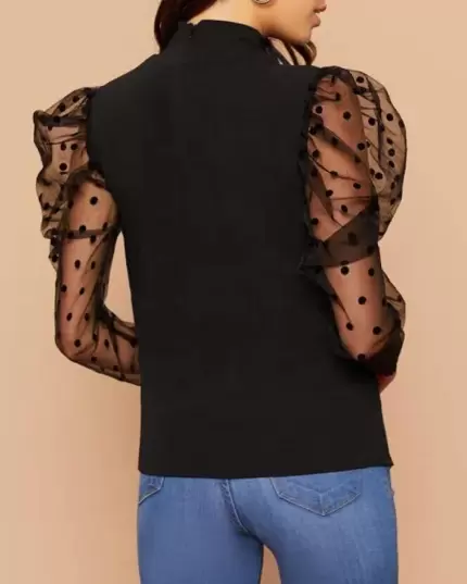 Blusa de cuellos alto con manga tipo Gigot transparente y abombadas a la altura de los hombros, súper elegante.