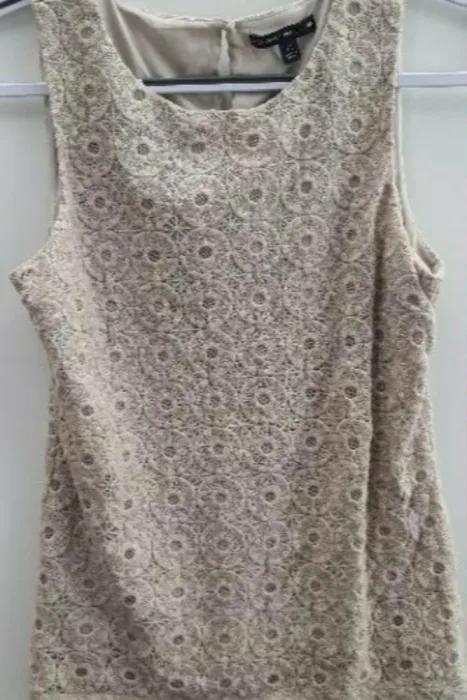 Blusa sin manga de encaje marca Banana Republic.Es color beige, viene forrada. Muy bonita y femenina.Talla M. Medidas aproximadas 40cm de axila a axila,65cm de largo desde el hombro.*TODAS MIS PRENDAS SE DESINFECTAN CON LYSOLLAVANDERIA PARA TU MAYOR TRANQUILIDAD*