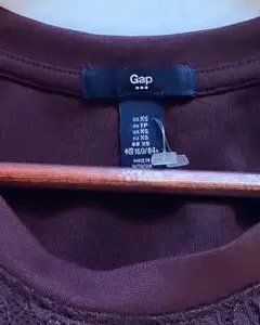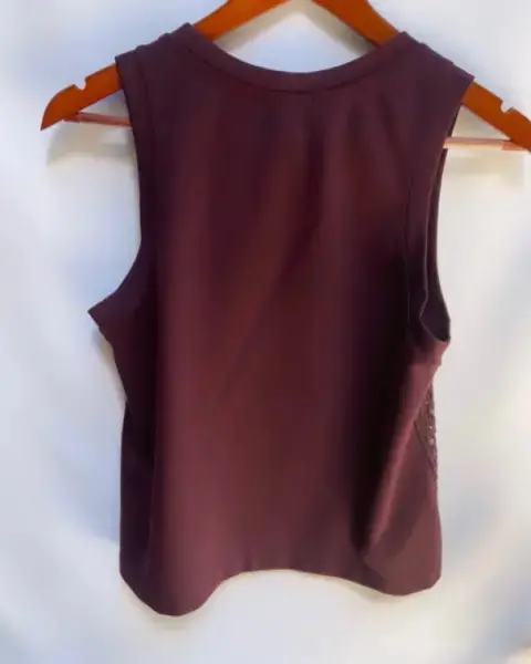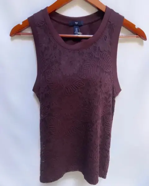 Blusa de encaje en la parte delantera. Blusa de encaje en la parte delantera, diseño de hojas y flores en color vino, escote redondo, ribete liso en cuello y sisa. Forrado en tela poliéster gruesa del mismo color. En espalda tela lisa sin encaje. Talla: XS (22-24) Puede quedar hasta una talla M. Marca: Gap.