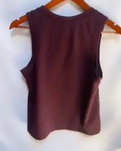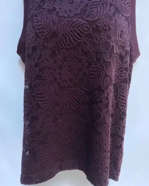 Blusa de encaje en la parte delantera, diseño de hojas y flores en color vino, escote redondo, ribete liso en cuello y sisa. Forrado en tela poliéster gruesa del mismo color. En espalda tela lisa sin encaje. Talla: XS (22-24) Puede quedar hasta una talla M. Marca: Gap.