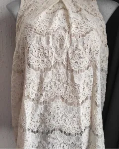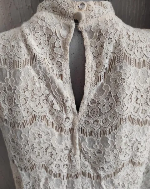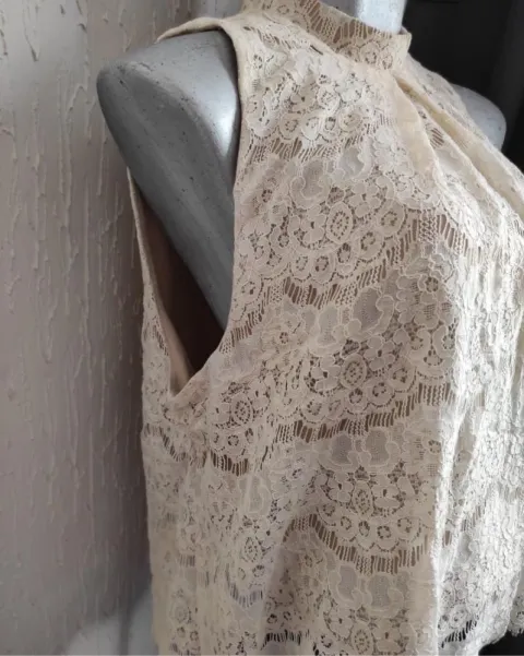 Preciosa blusa beige en encaje cuello alto sin manga con forro