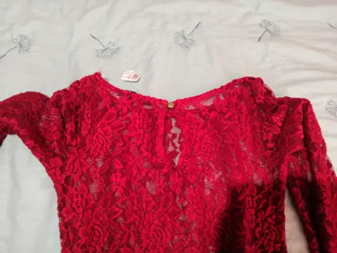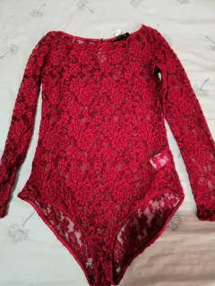 Blusa de encaje muy suave la tela no irrita no raspa, el escote es redondo, tela stretch da entre una talla 26 a 30 maximo calculo, no tiene broches es enterizo