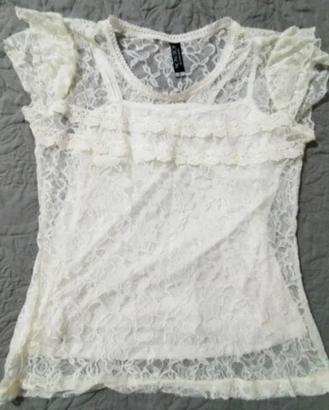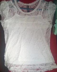 Blusa de encaje y top. Blusa de encaje suave y delgado. Color hueso. Cuenta con su top. La talla dice G considero le queda a una talla Mediana y a una grande pero ya muy ajustada como a mi☀️Es nueva sin etiqueta, solo me la medi🙂.