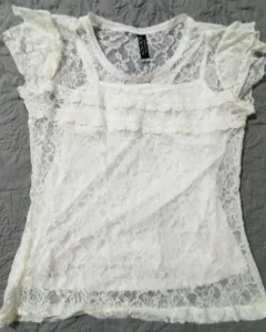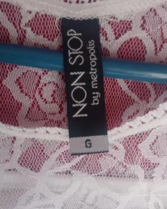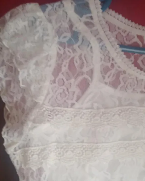 Blusa de encaje suave y delgado. Color hueso. Cuenta con su top. La talla dice G considero le queda a una talla Mediana y a una grande pero ya muy ajustada como a mi☀️Es nueva sin etiqueta, solo me la medi🙂.