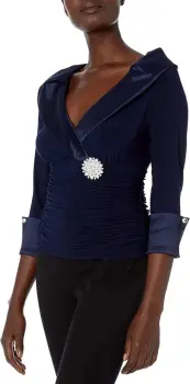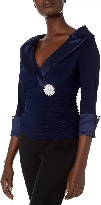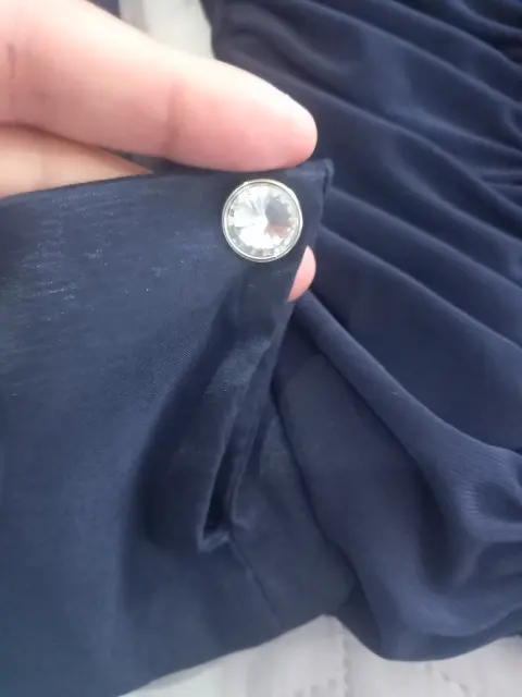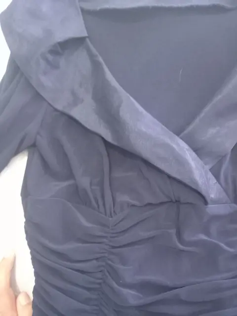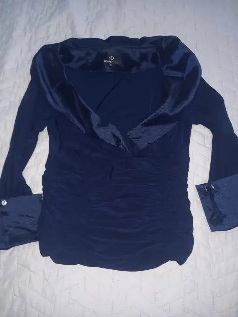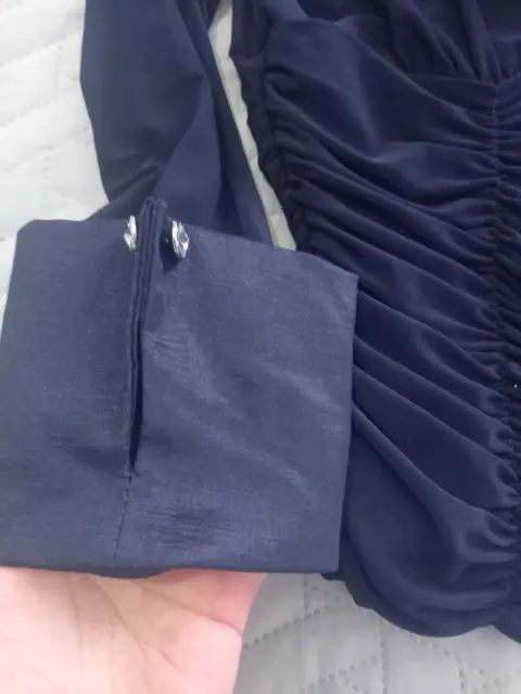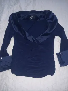 Blusa de fiesta azul marino. Hermosa y elegante blusa azul marino, cuello hermoso y mangas tres cuartos con mancuernillas ajusta hermoso a la cintura es stretch, talla M mide de axila a axila 47 cm sin estirar de largo desde hombro 57cm