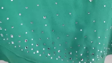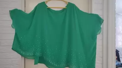 Blusa doble, asimétrica, cuello de ojal y mangas de murciélago.Tela tipo gasa, con pedrería en la parte de abajo.Tiene unas manchitas que se pueden apreciar en la 4a foto. Salen con una lavada.