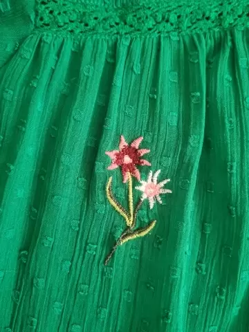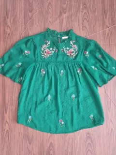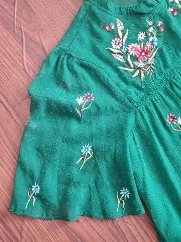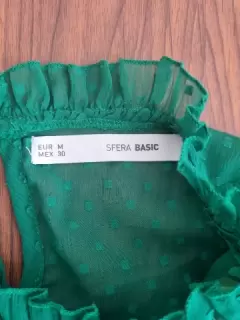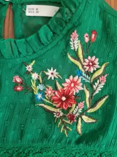 Blusa de gasa verde bandera. Blusa zara verde bandera transparente con bordado de flores y olanes, cuello alto, ajustado con botones