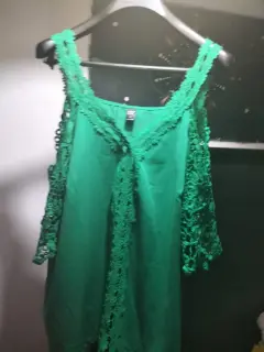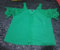 Blusa de hombros. Casual verde encaje en contraste manga media, tela liso, hombros descubiertos