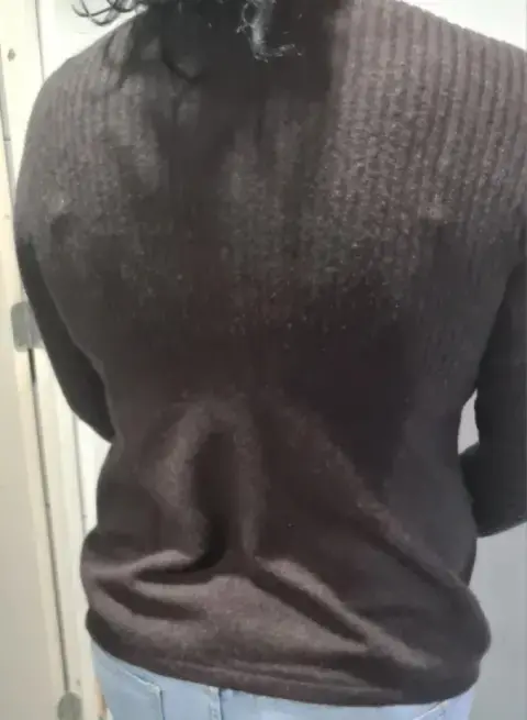 Es talla s pero puede dar una talla M qué sea delgada para que no deforme el bonito estilo, no tiene ningún detalle, el largo de la manga es de 49 cm, es muy calentita
