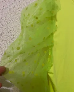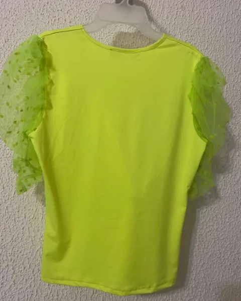 Padrísima blusa de lickra en color amarillo fosfo con manga de Tul y lunares , escote en v
