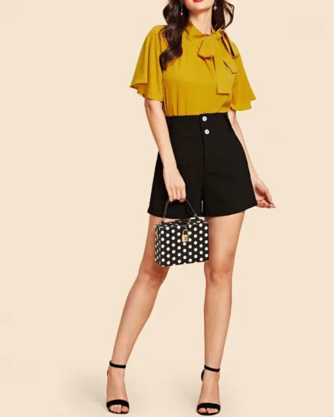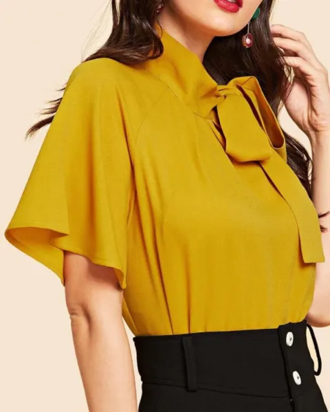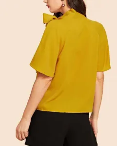 Lindisima Blusa de manga corta con corbatín tipo moño en el cuello, es color mostaza se ve muy bien puesta, talla M de Shein.