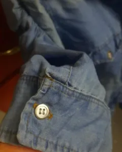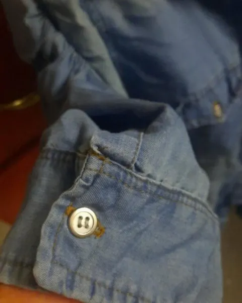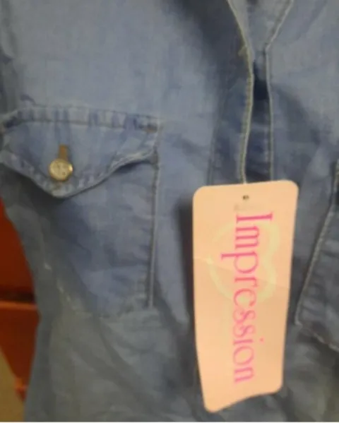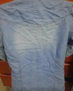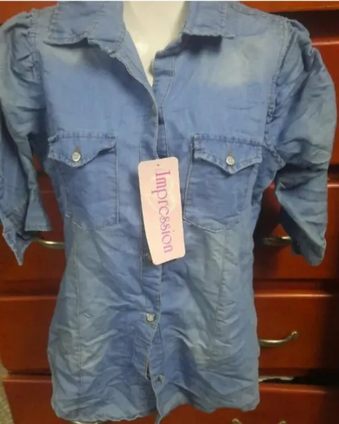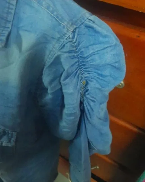 Blusita de mezclilla delgada y strech azul claro estilo deslavado, con bolsas en las solapas y mangas corrugadasMedidas:De hombro a hombro 44 De pecho 47.5 Cintura 42 Largo 61