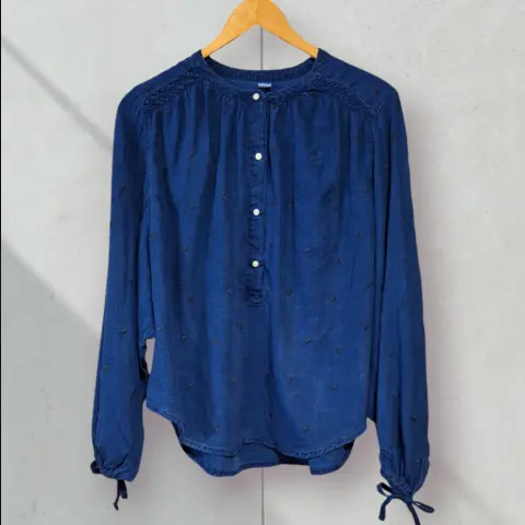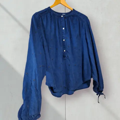 Blusa de Mezclilla con Corazones Bordados, manga larga con listines, mezclilla ligera, corazones ♥️ bordados. Talla S pero tambien queda bien a M por que es holgada Medidas: De axila a axila 71cm largo delante 61cm largo de atrás 65cm