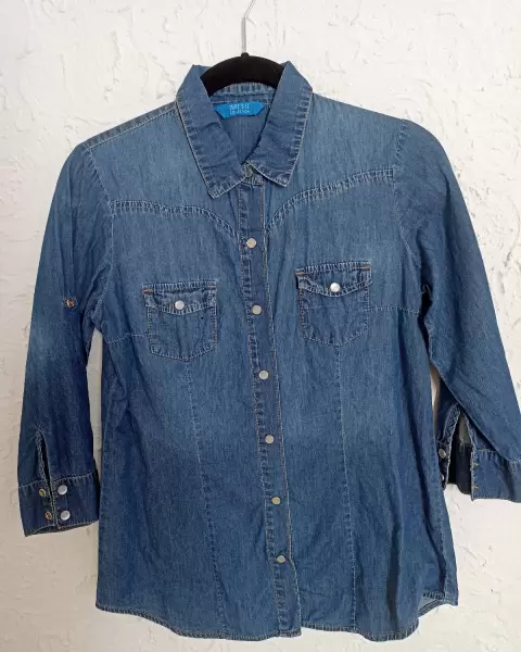 Puesta muy pocas veces , blusa de mezclilla talla chica amplia con bolsas frontales en parte del busto mangas 3/4