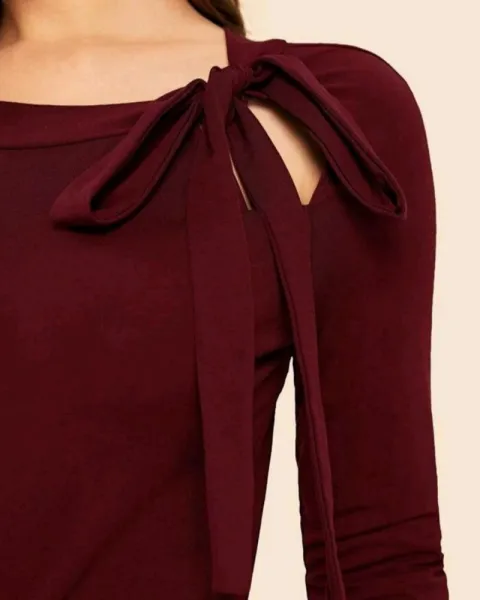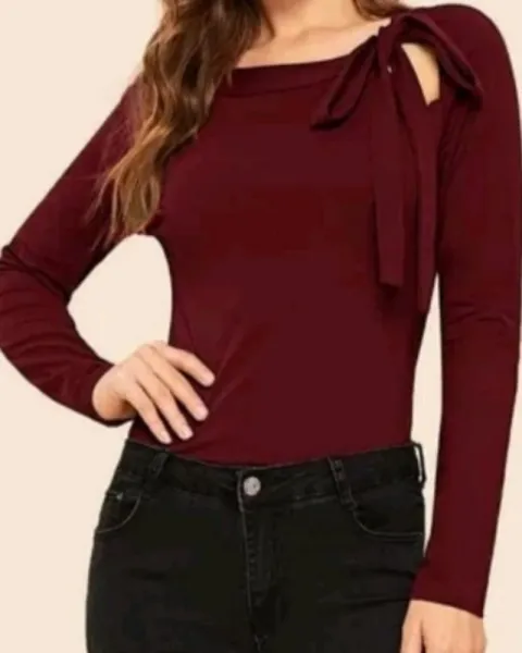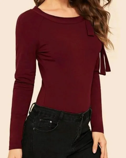 Blusa De Mujer Nudo Delantero Ajustable. Blusa De Mujer con Nudo Delantero con diseño de Abertura, estilo elegante, cuello redondo, manga larga, es ajustable, color vino, talla L, tiene una sola puesta por lo que se encuentra prácticamente nueva, se puede lavar en lavadora