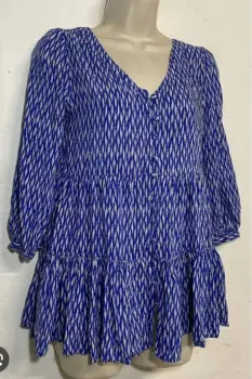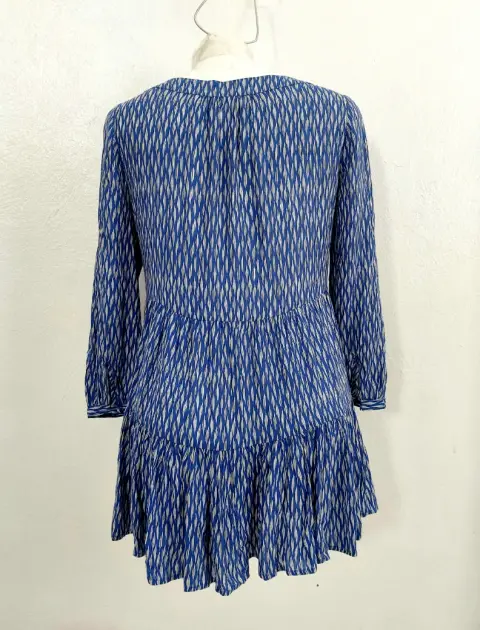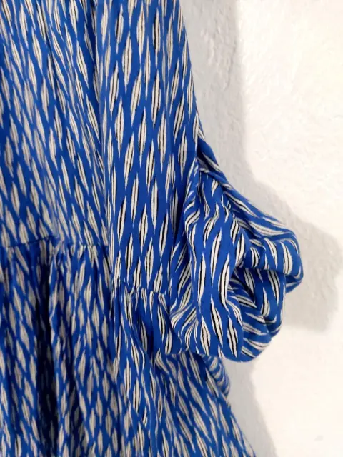 Bellisima! 😍Botones forrados de la misma tela.Talla XS, quizá queda a S, pero revisa bien tus medidas.No tiene detalles y está como Nueva.La tela tiene caída y no tiene strech.De axila a axila: 47 cmHombros: 37 cmLargo: 63 (delantero) y 71 (trasero), queda más larga de atrás.Largo manga: 50 cmTono azul rey con blanco.