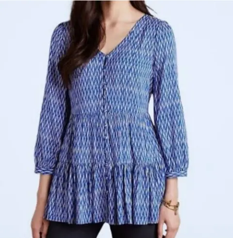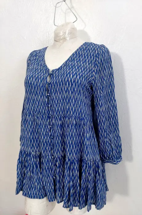 Blusa de paneles cuello V. Bellisima! 😍Botones forrados de la misma tela.Talla XS, quizá queda a S, pero revisa bien tus medidas.No tiene detalles y está como Nueva.La tela tiene caída y no tiene strech.De axila a axila: 47 cmHombros: 37 cmLargo: 63 (delantero) y 71 (trasero), queda más larga de atrás.Largo manga: 50 cmTono azul rey con blanco.