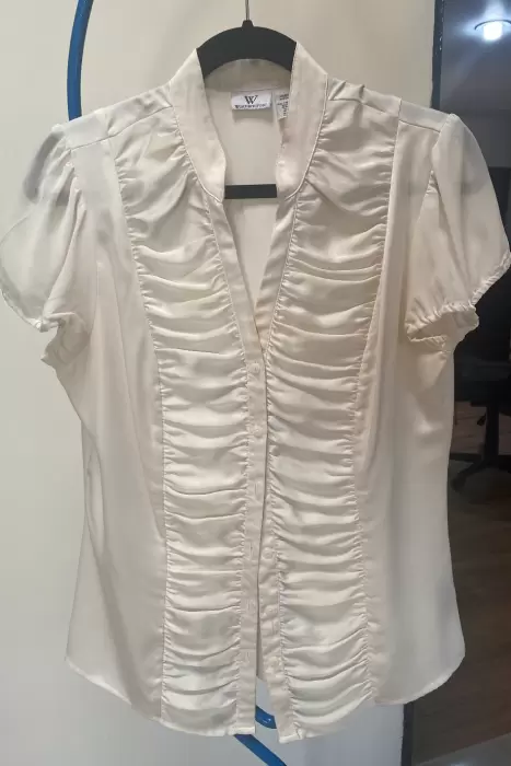 Blusa de Satén con fruncido. La Blusa es de una tela tipo Satín, las mangas de Organza y éstas tienen un resorte para ajustar mejor, el frente tiene un fruncido en todo el torso que hace que te estilice la figura y cuenta con un ligero escote, tiene una mancha muy pequeña casi imperceptible al frente que está anexada en las fotos.