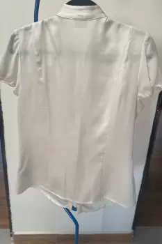 La Blusa es de una tela tipo Satín, las mangas de Organza y éstas tienen un resorte para ajustar mejor, el frente tiene un fruncido en todo el torso que hace que te estilice la figura y cuenta con un ligero escote, tiene una mancha muy pequeña casi imperceptible al frente que está anexada en las fotos.