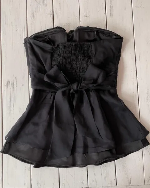 Talla: XS, con listones a los lados para hacer un moño, resorte en la espalda, strapless y con copas. Medidas: 36 cm de axila (SIN ESTIRAR), 31 cm de cintura (SIN ESTIRAR) y 41 cm de largo. No tuvo uso y no tiene detalles.
