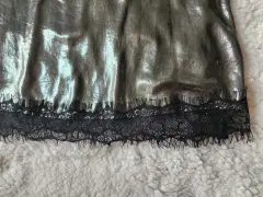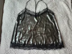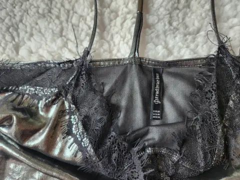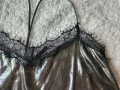 Blusa de tirantes. Blusa de tirantes, color girs de tela metalizada ligera, con encange negro en parte del pecho y lanparte baja.