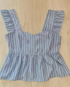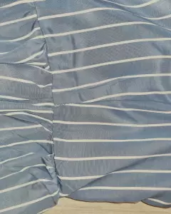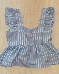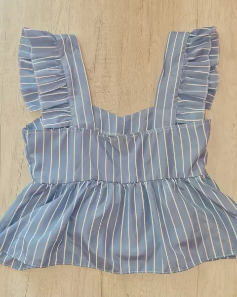 Top de tirantes celeste con blanco, cierre por un costado, es un poco corto del talle, asi que no es un top que queda largo. La tela no estira pero es muy fresca. Tiene un ligero detalle en una costura (ver penúltima foto). Solo lo usé 2 veces.