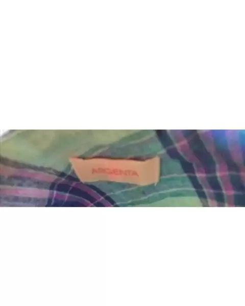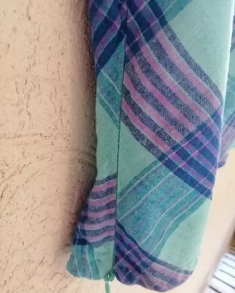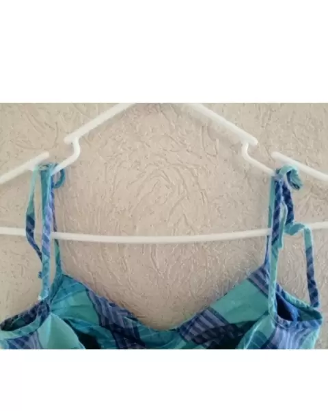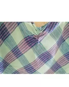 Es talla S, tipo top, con estampado a rayas estilo campesina. Es color azul claro con morado. Tiene cierre en la parte lateral, está super bonita 😍!!