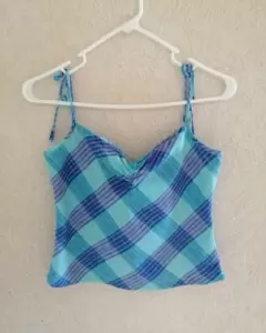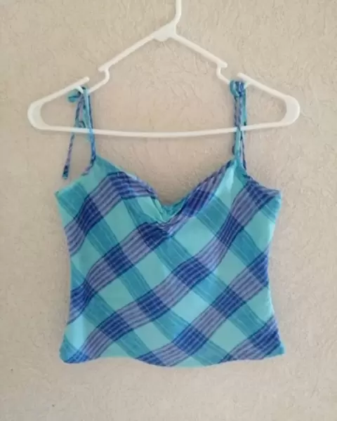 Blusa de tirantes escote en V. Es talla S, tipo top, con estampado a rayas estilo campesina. Es color azul claro con morado. Tiene cierre en la parte lateral, está super bonita 😍!!