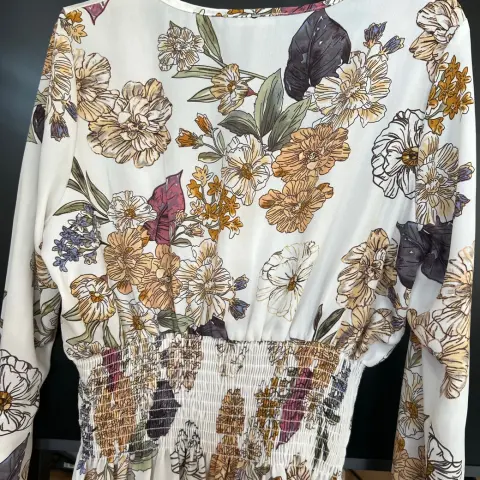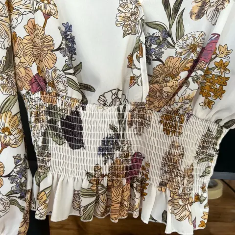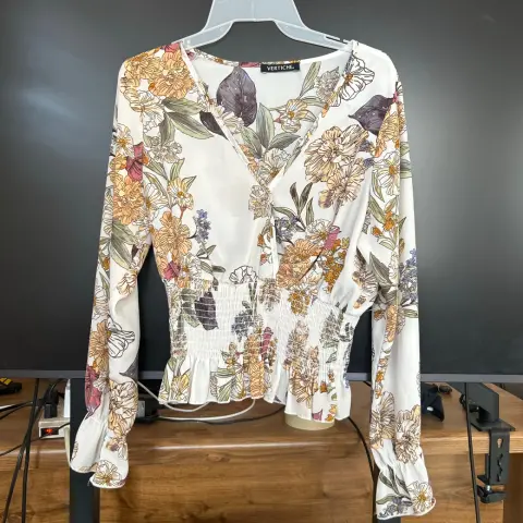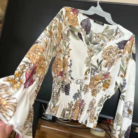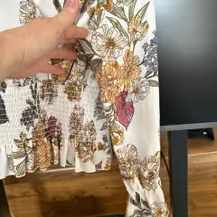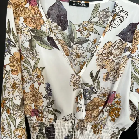 Blusa de vestir. Blusa color beige con estampado de flores de colores, elástico en la cintura y en las mangas, mangas largas, escote cruzado tipo V, poliéster, tela fresca respirable, talla S/M marca VERTICHE muy poco uso en excelentes condiciones