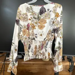 Blusa color beige con estampado de flores de colores, elástico en la cintura y en las mangas, mangas largas, escote cruzado tipo V, poliéster, tela fresca respirable, talla S/M marca VERTICHE muy poco uso en excelentes condiciones