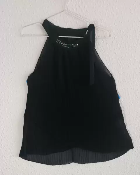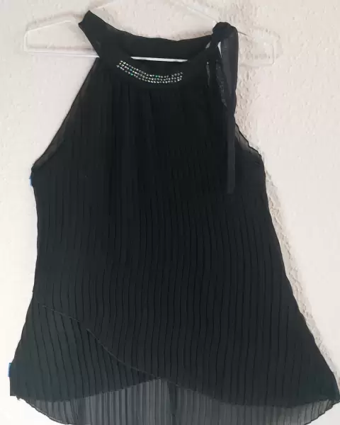 Blusa muy elegante, plisada, tela tipo tul, con hombros descubiertos y dismantitos en el cuelloSe abrocha en la parte trasera del cuelloIdeal para pantalón formalLista para un evento formal de dia, comida elegante, cena eleganteExcelente estado