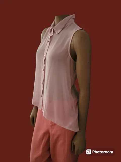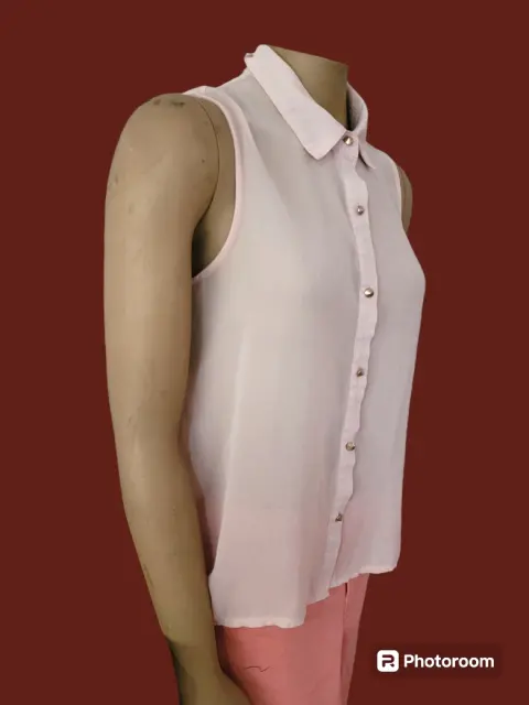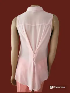 Blusa de Vestir Sans Sousi, talla mediana, color rosa palido, cuello alto en V, sin mangas, botones de copa dorados, tela transpirable de poliéster, cola de pato, espalda con detalles de botones dorados, mide 28cm de hombro a hombro, 45cm de axila a axila, 44cm de cintura, 57cm del hombro hacia abajo al frente y 72cm de la parte de atras, previamente usada en buen estado cosmetico.
