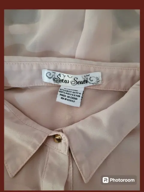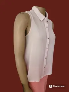 Blusa de Vestir Sans Sousi. Blusa de Vestir Sans Sousi, talla mediana, color rosa palido, cuello alto en V, sin mangas, botones de copa dorados, tela transpirable de poliéster, cola de pato, espalda con detalles de botones dorados, mide 28cm de hombro a hombro, 45cm de axila a axila, 44cm de cintura, 57cm del hombro hacia abajo al frente y 72cm de la parte de atras, previamente usada en buen estado cosmetico.
