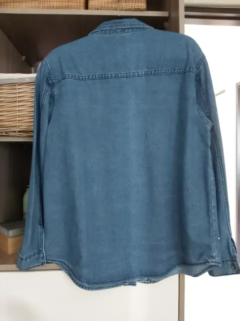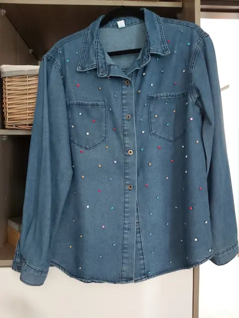 Linda blusa de mezclilla con cristales al frente, la puedes utilizar como sobre camisa, esta lista para estar en tu clóset