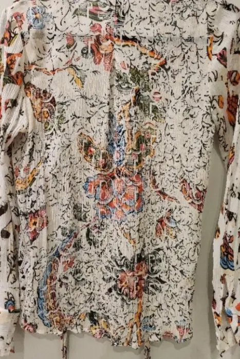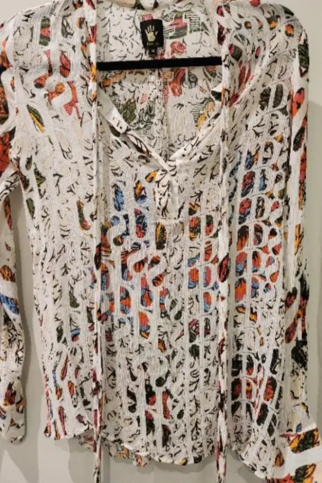 Blusa Desigual de corte recto con multidiseño y cintillo de amarre en cuello. Composicion de viscosa y seda