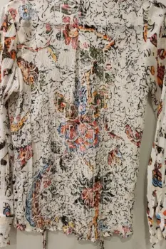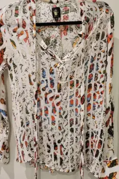 Blusa Desigual. Blusa Desigual de corte recto con multidiseño y cintillo de amarre en cuello. Composicion de viscosa y seda