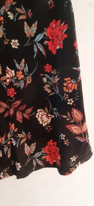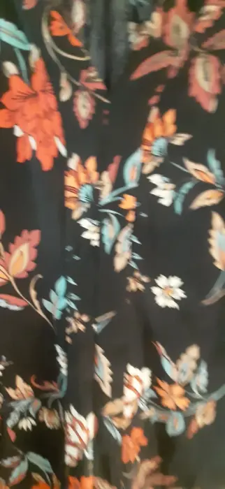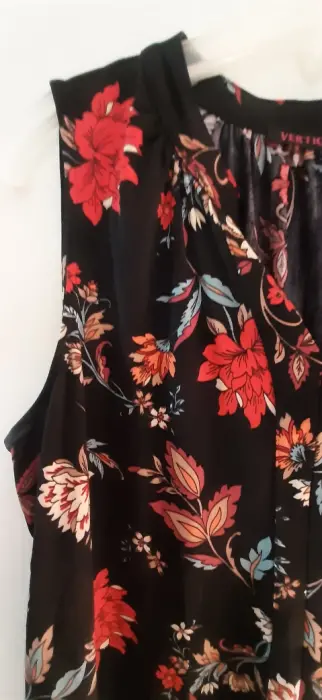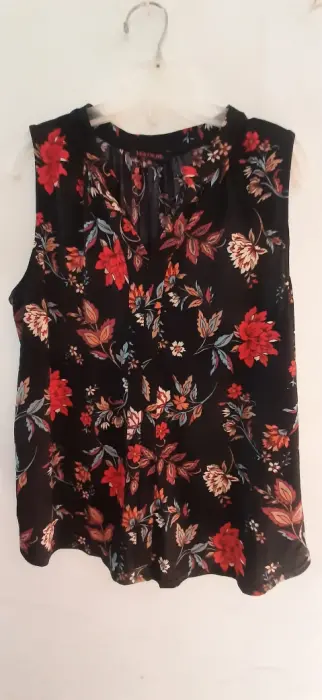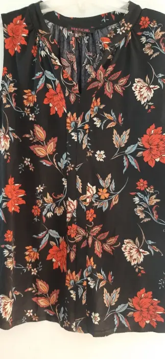 Blusa desmangada fondo negro con motivos florales.. Blusa talla 40 negra desmangada, elastica. Holgada y cuello redondo con escote en V.