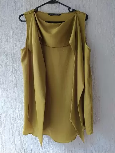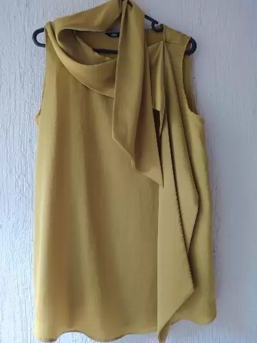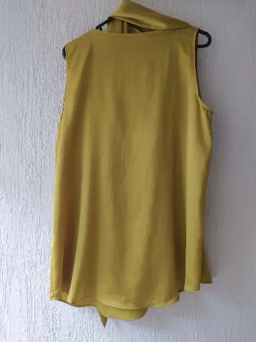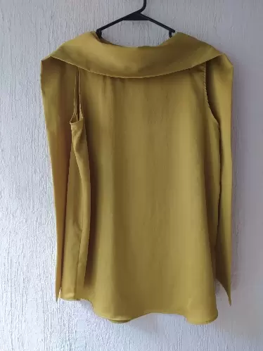Hermosa blusa dorada con liston que se puede usar de varias formas, tela suave y cómoda, viene larga y ancha. Es S pero le quedaría a una M.