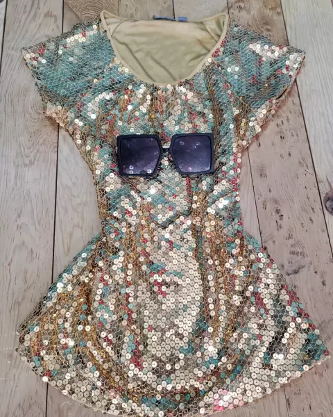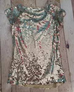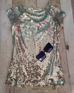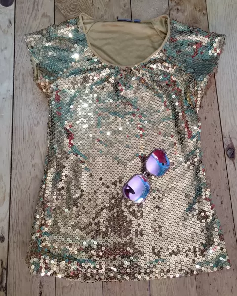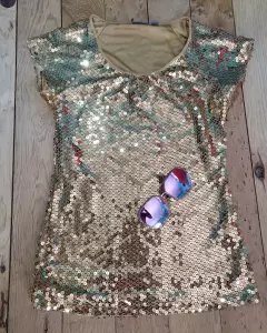 Llamativa blusa de lentejuela dorada, para llamar la atención a donde quiera que vayas. Tiene algunos detalles pero no afecta nada a la estética.