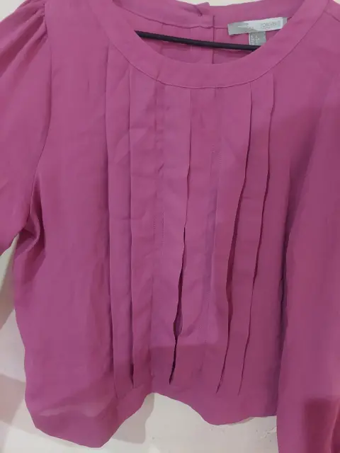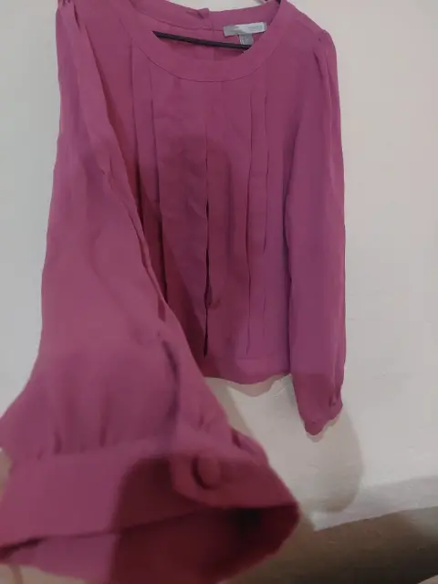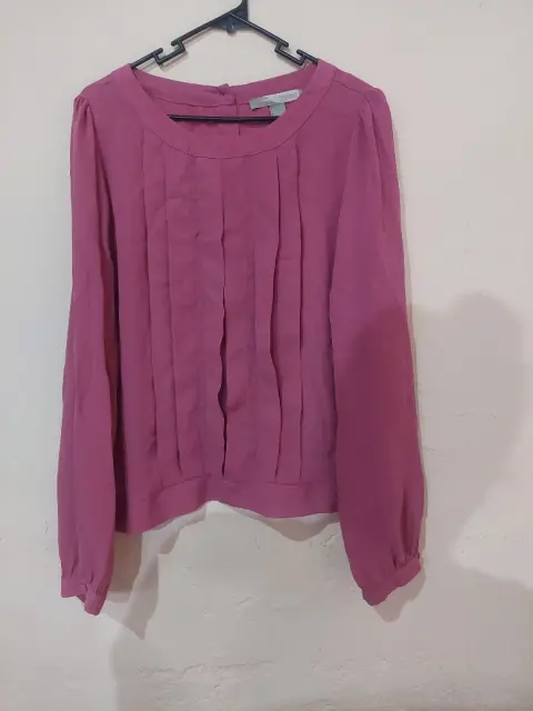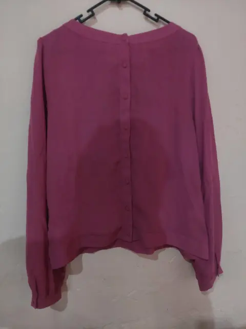 Esta preciosa blusa de manga larga color bugambilia tiene un plizado en la parte frontal que le da un toque elegante y botones en la espalda.