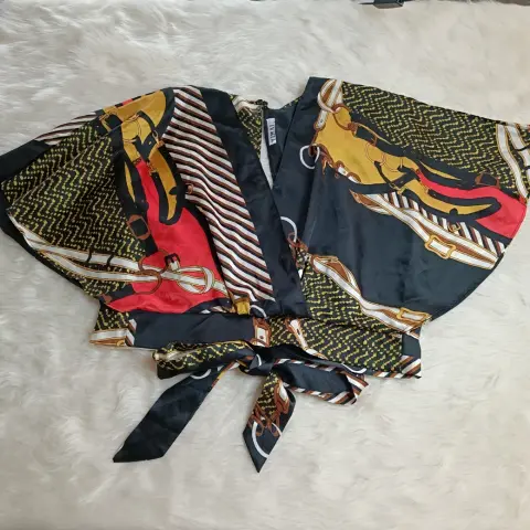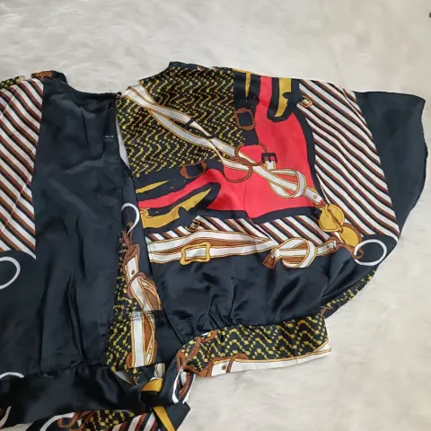 Blusa elegante negra. ¡Misteriosa y cool! Blusa negra con detalles de colores y cadenas, talla G. ¡Comprala ya y lleva el estilo al siguiente nivel! ️✨