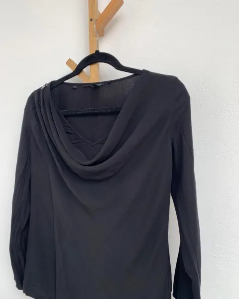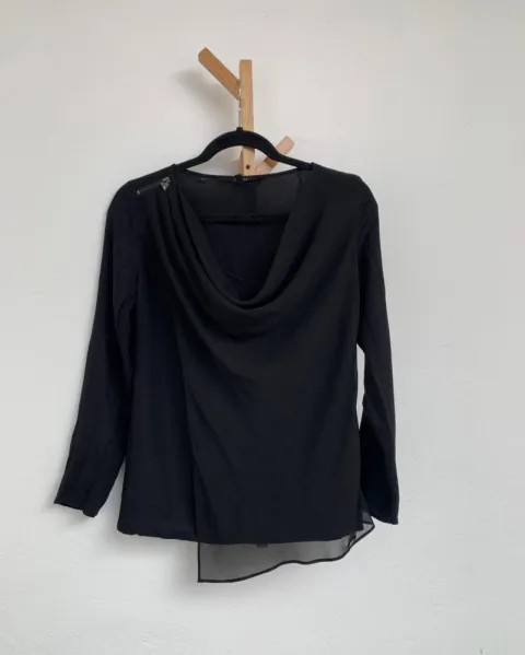 Esta blusa está preciosa, tiene un diseño muy padre que no logra apreciarse tanto en la foto, pero tiene una tela delgada que atraviesa la blusa. Talla dice XS pero queda perfecto a talla Ch. Medidas: hombro a hombro 39 cm, pecho 45 cm, largo 69 cm. Cabe mencionar que la tela estira del torso estira un poco