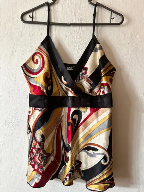 Blusa marca Aspik, talla grande, en tela satinada multicolor, de tirantes y cuello en V, en excelentes condiciones de medio uso