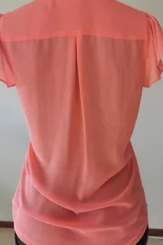 Blusa en tono neon de manga corta formal. Blusa en tono naranja color neon, con botones al frente, manga corta con caida suelta, escote en V y la tela se transparenta