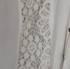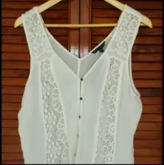 Bonita blusa sisada color crema con detalles de encajen parte delantera, su cuello es en V tanto de adelante como de atrás.